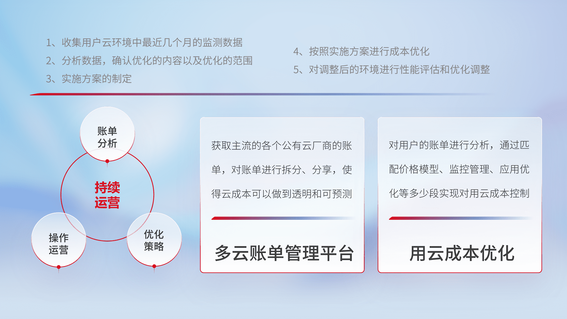 通过多云纳管,,,以统一的资源数据模型把客户的云资源进行抽象和封装,,进而实现对多云资源的统一操作,,保障云资源管理的可靠性、、、、稳定性与可用性。。。量身定制化运维内容,,配置、、、开发运维、、、补丁管理、、备份、、、、监控、、、认证和访问管理、、审计和日常巡检等,,,,保障在用云过程中的可靠度,,,,稳定度以及高可用率。。